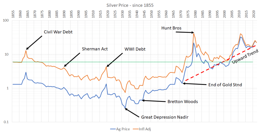The complete abandonment of silver within a bimetallic monetary system came about thru the Gold Standard Act of 1900. Gold became the sole precious metal where paper notes could be exchanged for gold on demand. Thus, silver continued its decline in price lasting nearly until the end of WWII but seeing a nadir during the Great Depression.